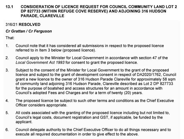 1. Further to Council’s resolution dated 26 October 2021 regarding this matter and in accordance with Section 55(3)(i) of the Local Government Act 1993, Council enter into a direct arrangement with the owner of 316 Hudson Parade, Clareville for the licence of Council Community Land Lot 2 DP 827733 adjoining 316 Hudson Parade, Clareville, as a satisfactory result would not be achieved by inviting tenders because of extenuating circumstances given: