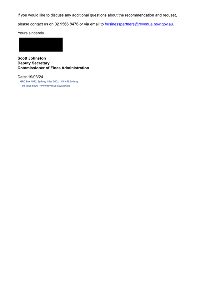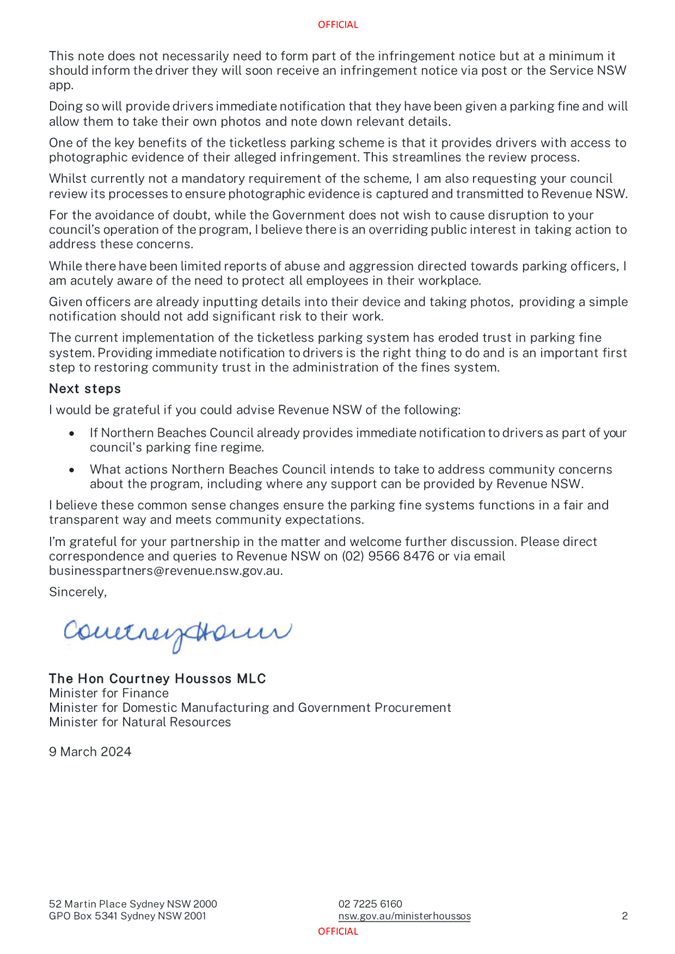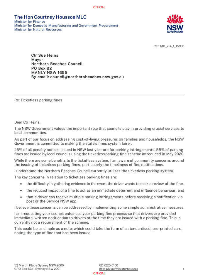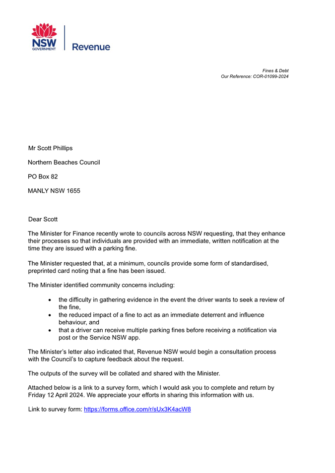 Attachment 2 : Letter to Council from Commissioner of Fines Administration - ITEM 12.5 - northern beaches council meeting - 25 June 2024