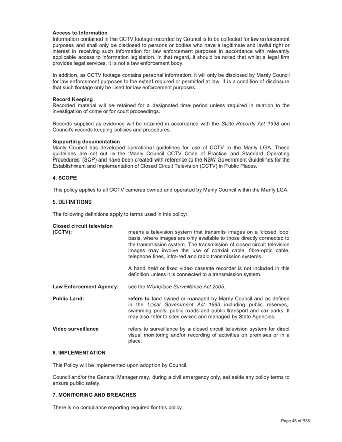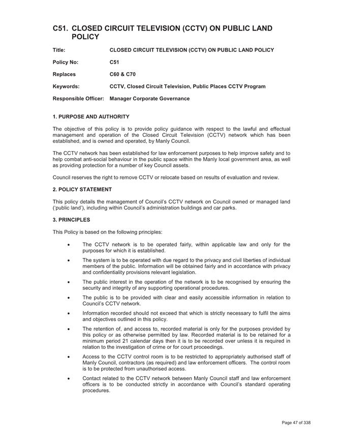 Attachment 1: Former Manly Council - Closed Circuit Television (CCTV) on Public Land Policy...................................................................................................... 714