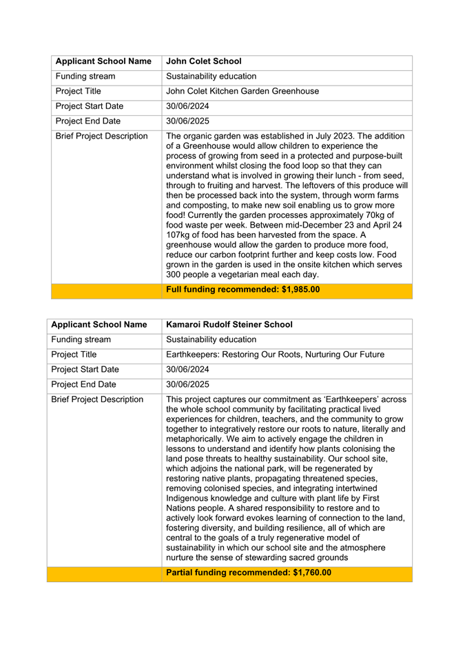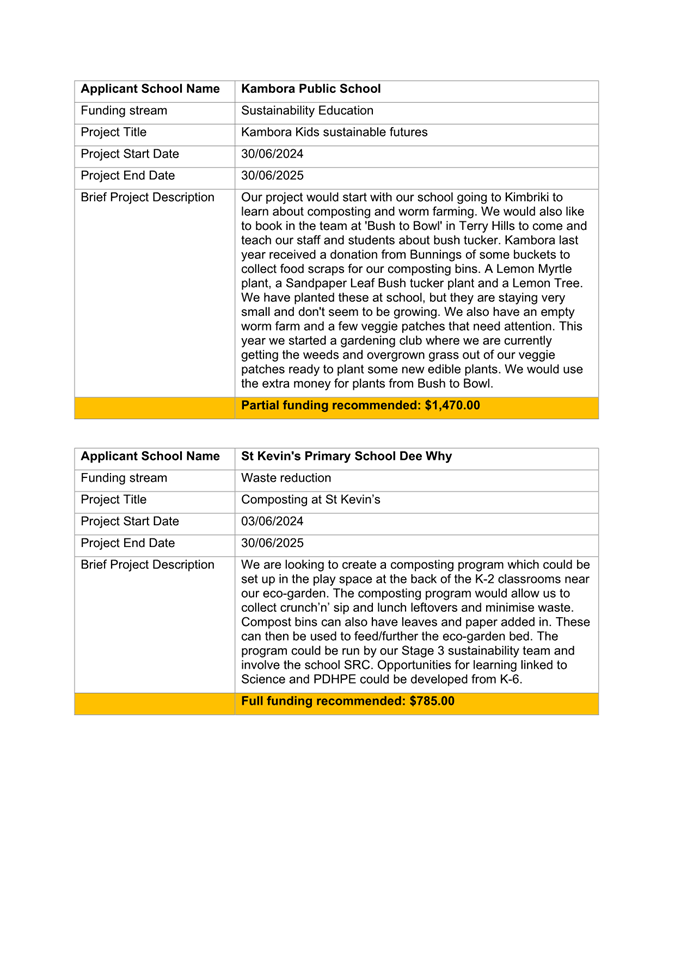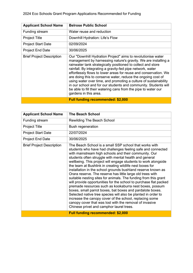 Attachment 1 : Eco Schools Grant 2024 Applications Recommended for Funding - ITEM 11.1 - northern beaches council meeting - 25 June 2024