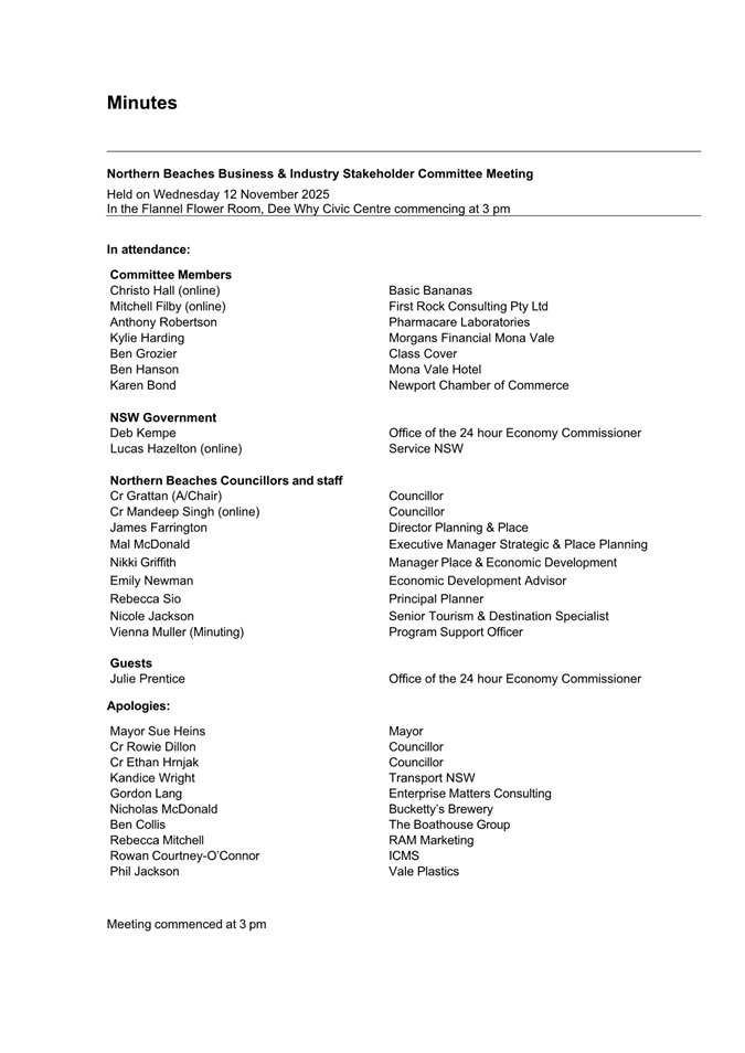 Attachment 1: Northern Beaches Business & Industry Stakeholder Committee - Minutes - Wed 12 Nov 2025.................................................................................. 643