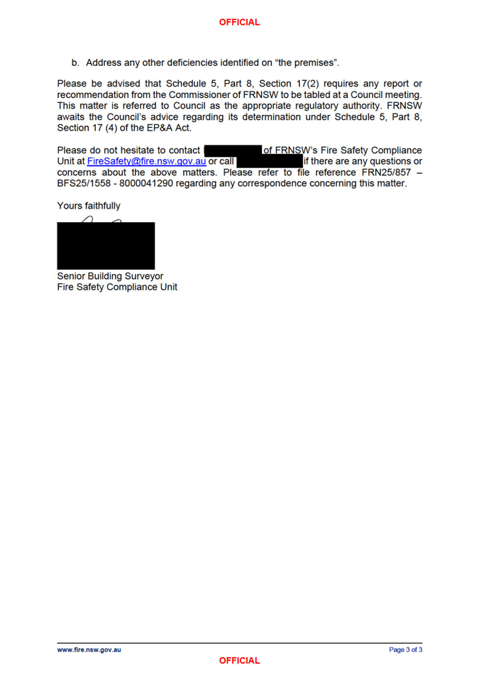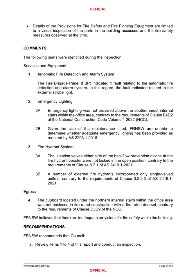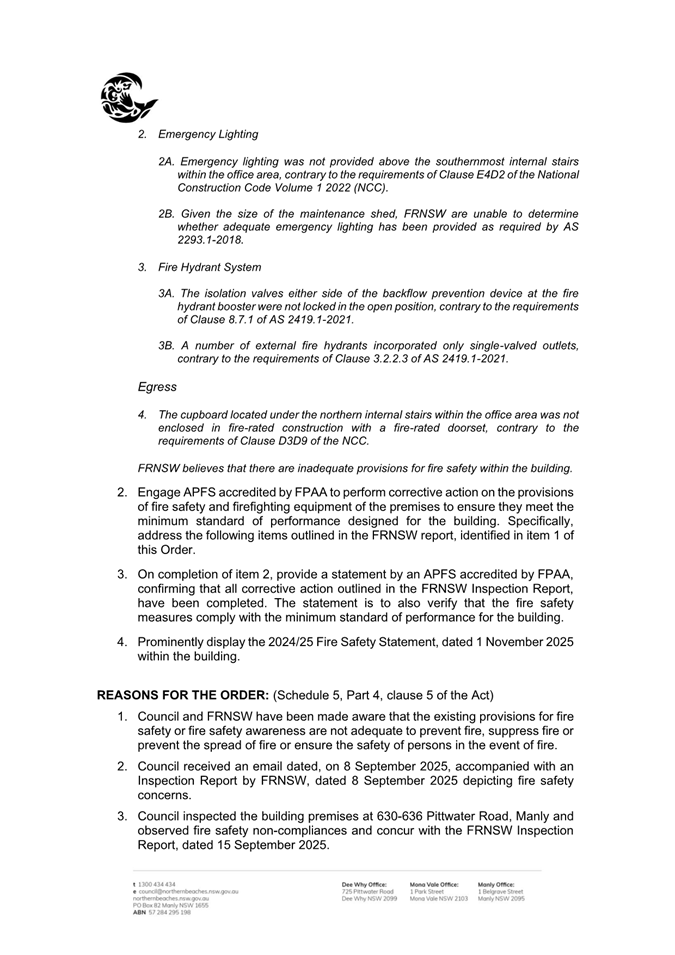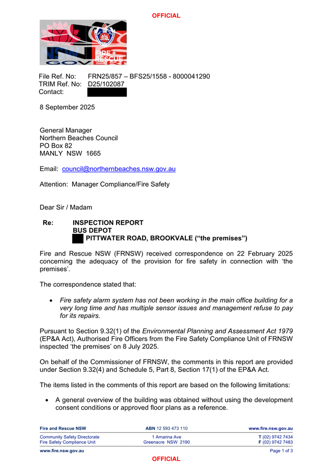 Attachment 1 : Fire & Rescue NSW Inspection Report dated 8 September 2025 - Pittwater Road Brookvale - ITEM 11.4 - Northern Beaches Council Meeting - 17 February 2026