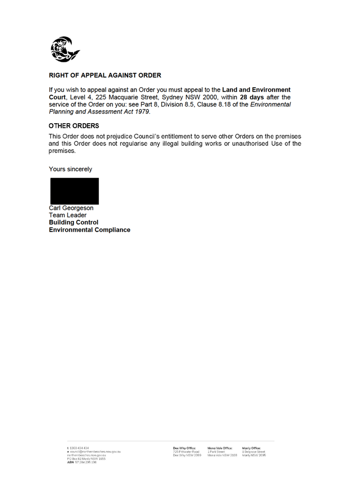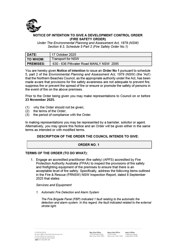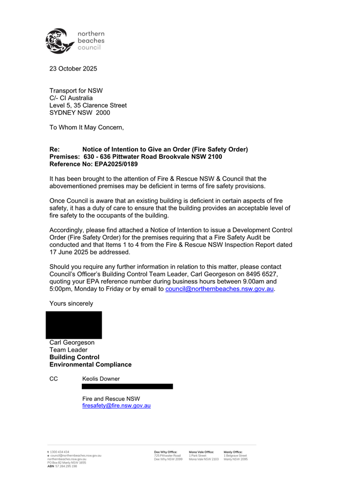 Attachment 2: Notice of Intention to give an Order dated 23 October 2025 - Pittwater Road Brookvale............................................................................................... 651