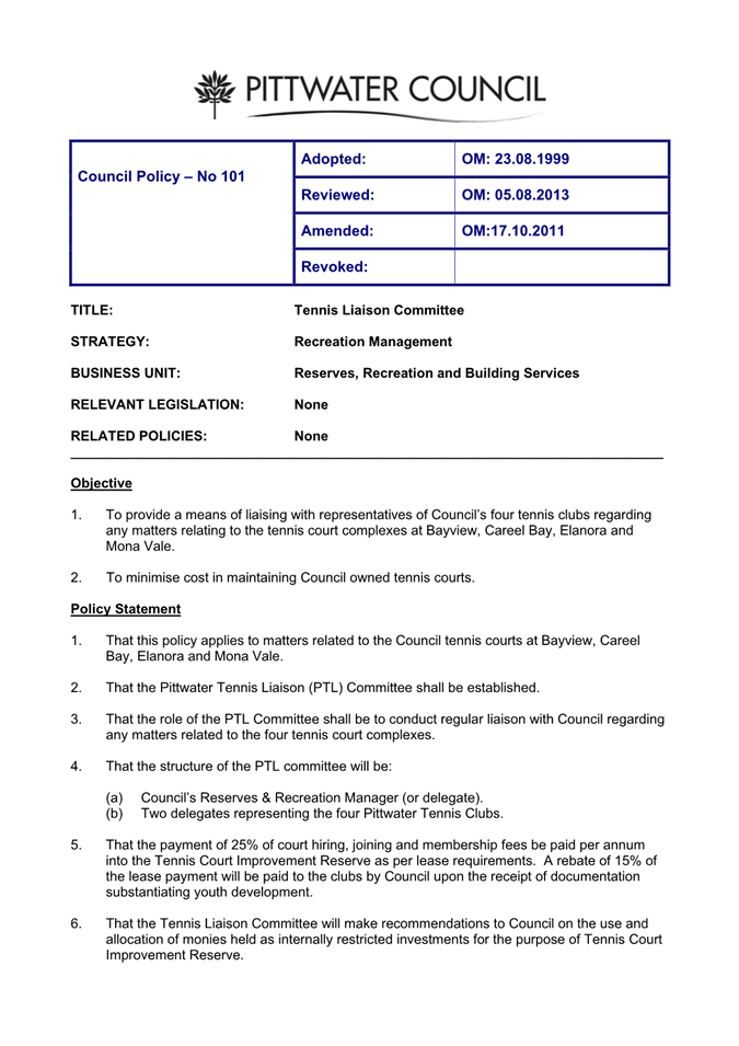 Attachment 1 : Tennis Liaison Committee (Policy No 101) - ITEM 12.1 - Northern Beaches Council Meeting - 17 February 2026